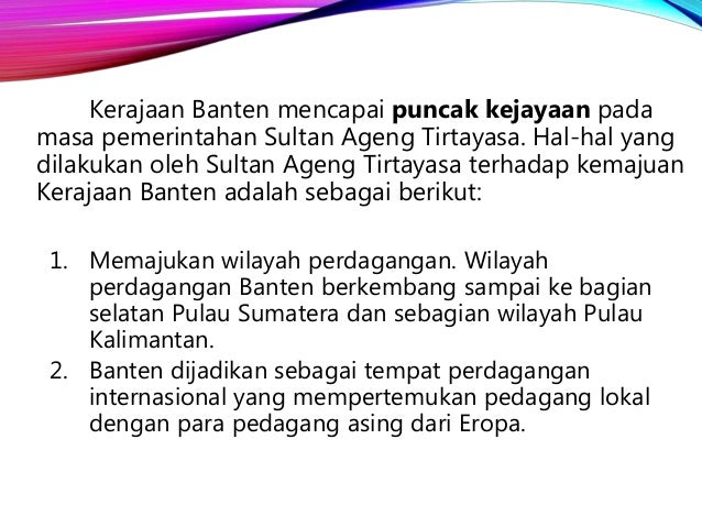 Kejayaan Kesultanan Banten pada Masa Sultan Ageng Tirtayasa. Memajukan wilayah perdaganganWilayah perdagangan Banten berkembang sampai ke bagian selatan Pulau Sumatera dan sebagian wilayah Pulau Kalimantan. Dalam usaha menaklukkan Palembang Maulana Muhammad tewas dan selanjutnya putra mahkotanya yang bernama Pangeran Ratu naik takhta.