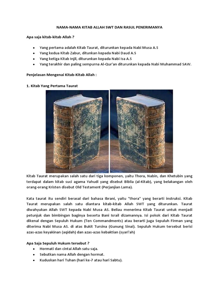Kitab Taurat adalah salah satu kitab suci yang diwahyukan Allah SWT kepada Nabi Musa AS untuk menjadi petunjuk dan bimbingan bagi dirinya serta Bani Israil. Kitab dan suhuf merupakan wahyu Allah Swt. Thora Nabin dan Khetubin yang terdapat dalam kitab suci agama Yahudi yang disebut dengan Biblia Al-Kitab yang belakangan oleh orang-orang Kristen disebut dengan Old Testament Perjanjian Lama Baca Juga.