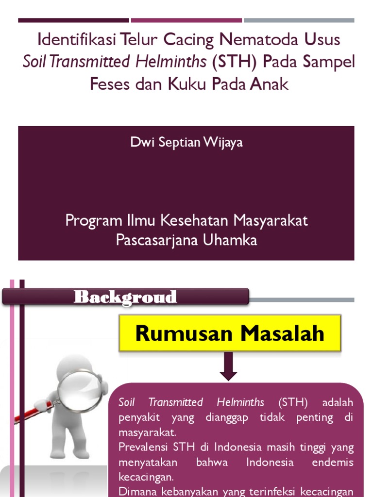 Menganalisis indeks ovitrap dan indeks pinjal. Metode Kato Katz merupakan metode yang lebih baik digunakan dari metode direct slide dalam mengidentifikasi jenis cacing Soil transmitted Helminth STH pada fase telurBerdasarkan Uji. Penularan Soil Transmitted Helminth STH salah satunya pada sayur brokoli yang dikonsumsi mentah.