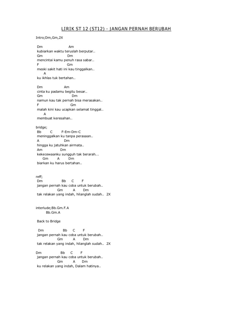 Berikut cuplikan syair nyanyian teks dari lagunya. Meski sakit hati ini kau tinggalkan. Jangan Pernah Berubah -ST12 intro Dm Gm 2X Dm Am kubiarkan waktu teruslah berputar.