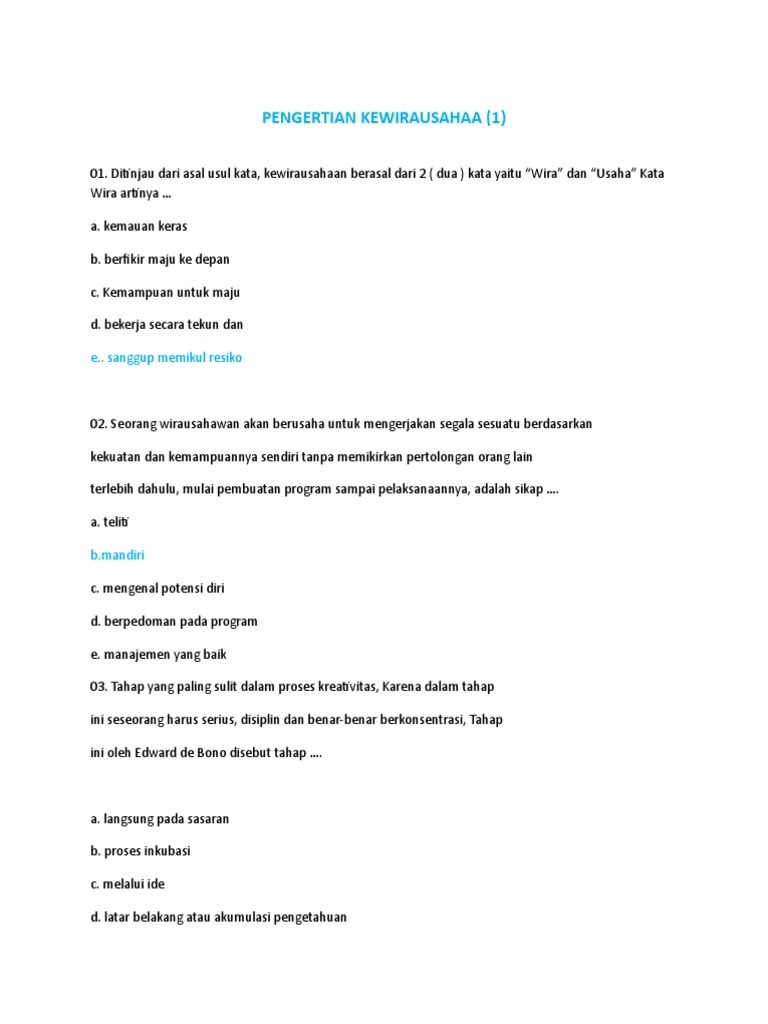 Soal Kewirausahaan Kwu Kelas 11 Sma Ma Dan Kunci Jawaban
