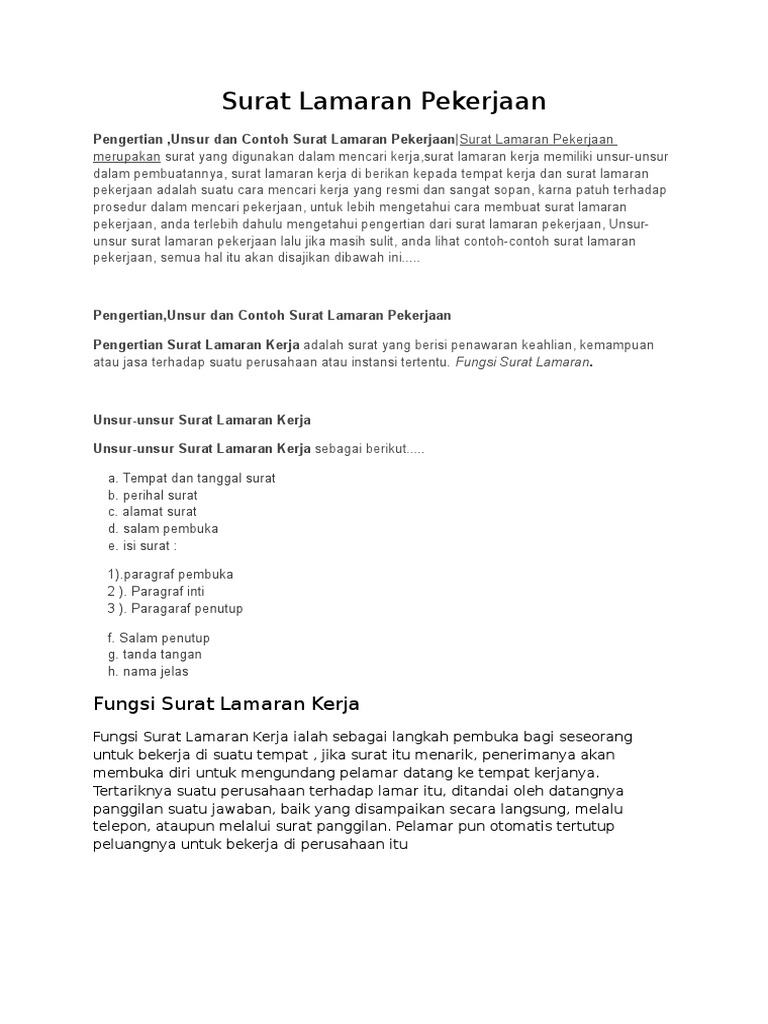 Surat lamaran pekerjaan adalah surat yang berisi permohonan untuk bekerja di suatu lembaga perusahaan atau perseoran terbatas PT yang pada umumnya memiliki bagian-bagian berisi identitas diri jasa yang dapat dilakukan pendidikan hingga keterangan keahlian dan pengalaman Kemdikbud 2017 hlm. Jika anda pernah bekerja pada sebuah perusahaan anda dapat meminta surat tersebut untuk dilampirkan dalam surat lamaran kerja. Surat lamaran pekerjaan adalah surat resmi yang dibuat dan dikirimkan oleh seseorang yang ingin bekerja di sebuah kantor perusahaan ataupun instansi tertentu.