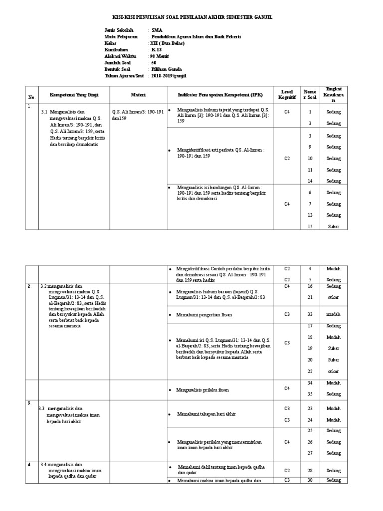 Soal Kunci UTSPTS PAI Kelas 10 Semester 1 Tahun 20212022. 45 contoh soal pg pai kelas 12 semester 1. Kelima materi PAI kelas 1 SD semester 1 diantaranya kasih sayang Al Quran Surah Al Fatihah Iman Kepada Allah Bersuci dan meneladai sifat-sifat Rasul.