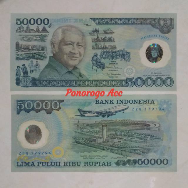 Uang 50 ribu polymer merupakan uang 50000 tahun 1993 penerbitan khusus uang ini juga disebut sebagai uang 50 ribu plastik. Uang kertas ini pertama diedarkan pada tahun 1993 dengan wajah presiden saat itu Soeharto dan yang terbaru diedarkan tahun emisi 2016 seri uang NKRI dengan wajah Ir.